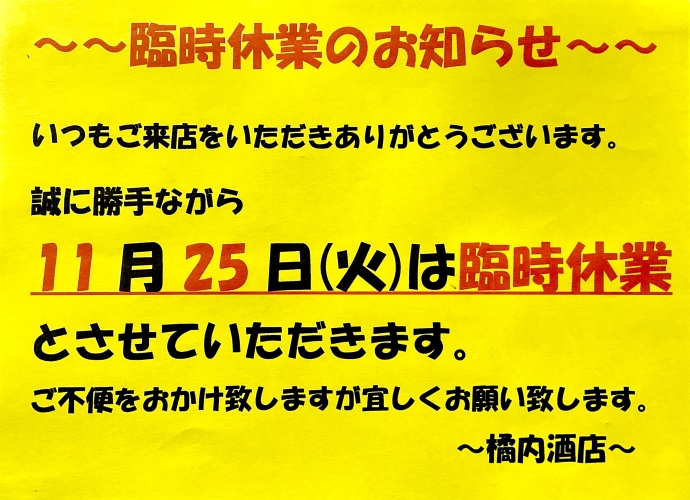 - 【 橘内酒店 臨時休業のお知らせです 】