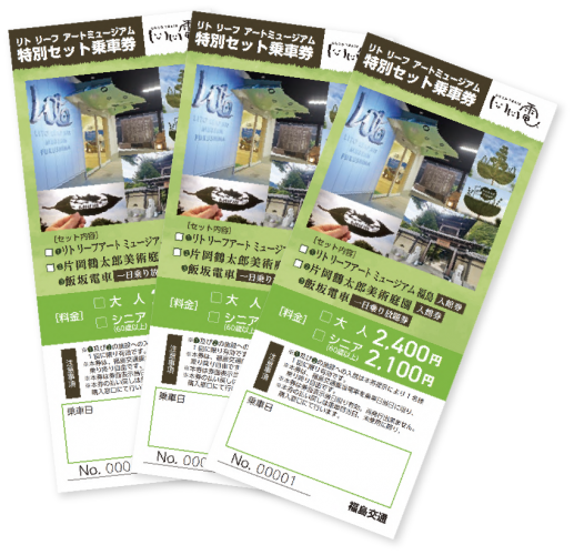 11月1日(土)より飯坂線では「リトリーフアートミュージアム福島」入館券、「福島片岡鶴太郎美術庭園」入館券と「飯坂電車1日乗り放題券」がセットとなった大変お得な特別セット乗車券の販売を開始いたします。